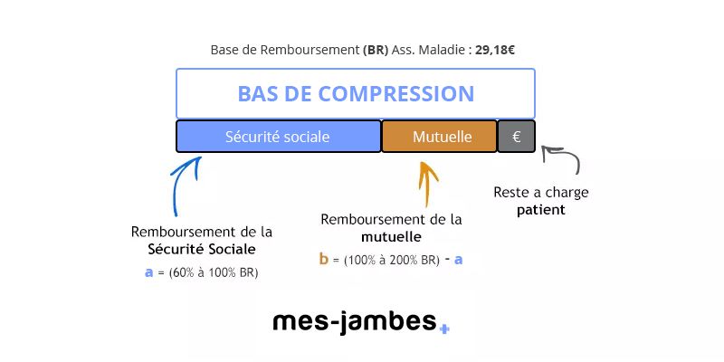 Cela signifie que lorsque vous achetez un bas de compression 36€, vous serez remboursé sur la base de 29,18€ : 60% par la sécurité sociale (17,51€), 40% par votre complémentaire (11,67€) et le dépassement de 6,82€ (36€ - 29,18€) sera pris en charge également par la complémentaire selon votre contrat.